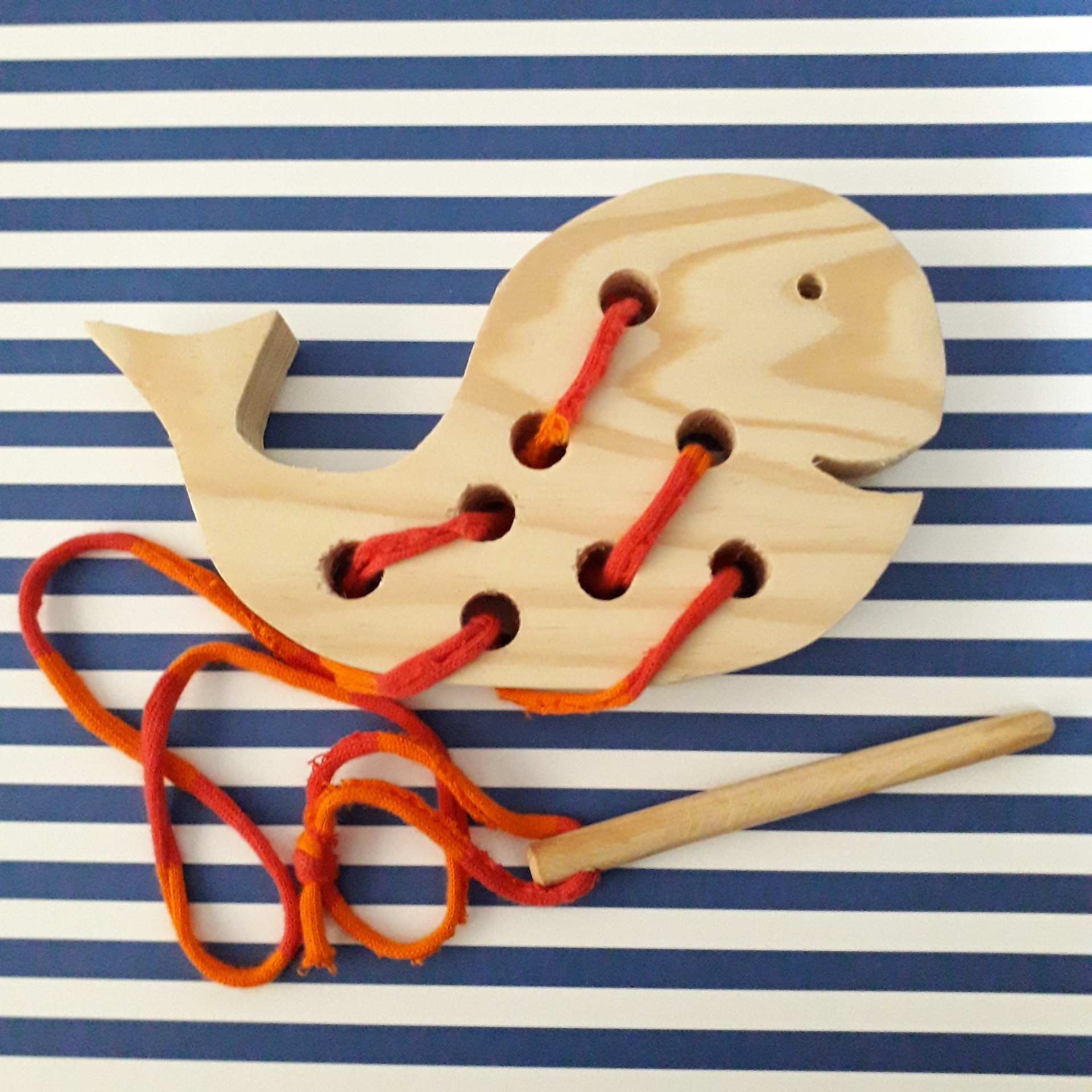 Um brinquedo de madeira para exercitar a motricidade fina, a coordenação olho-mão e a concentração. Os Animais de Enfiar trazem uma agulha de madeira e o objectivo é enfiar o fio nos buracos.