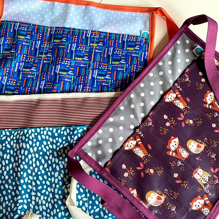 • Aventais coloridos com padrões variados incluindo bolinhas, riscas, lápis e raposas.