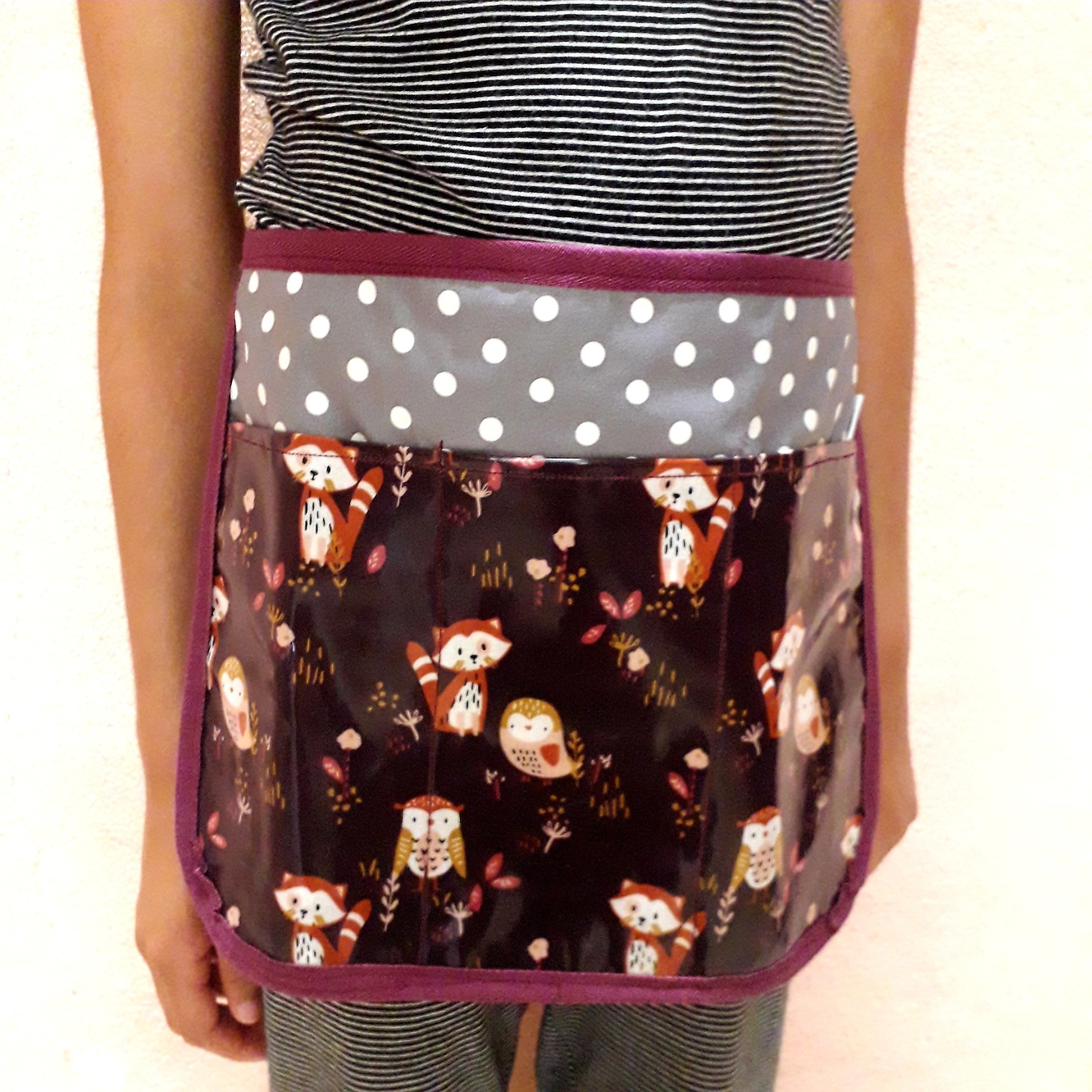 • Avental infantil com padrão de raposas e corujas, bordas roxas e cintura cinzenta com bolinhas brancas