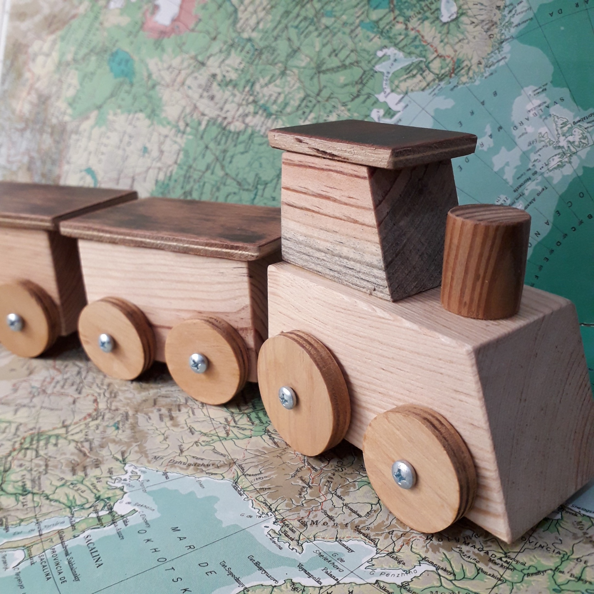Os comboios de madeira são feitos com madeira reaproveitada de mobiliário, podas, etc e todos contam a história do que foram antes de se transformarem no teu brinquedo.