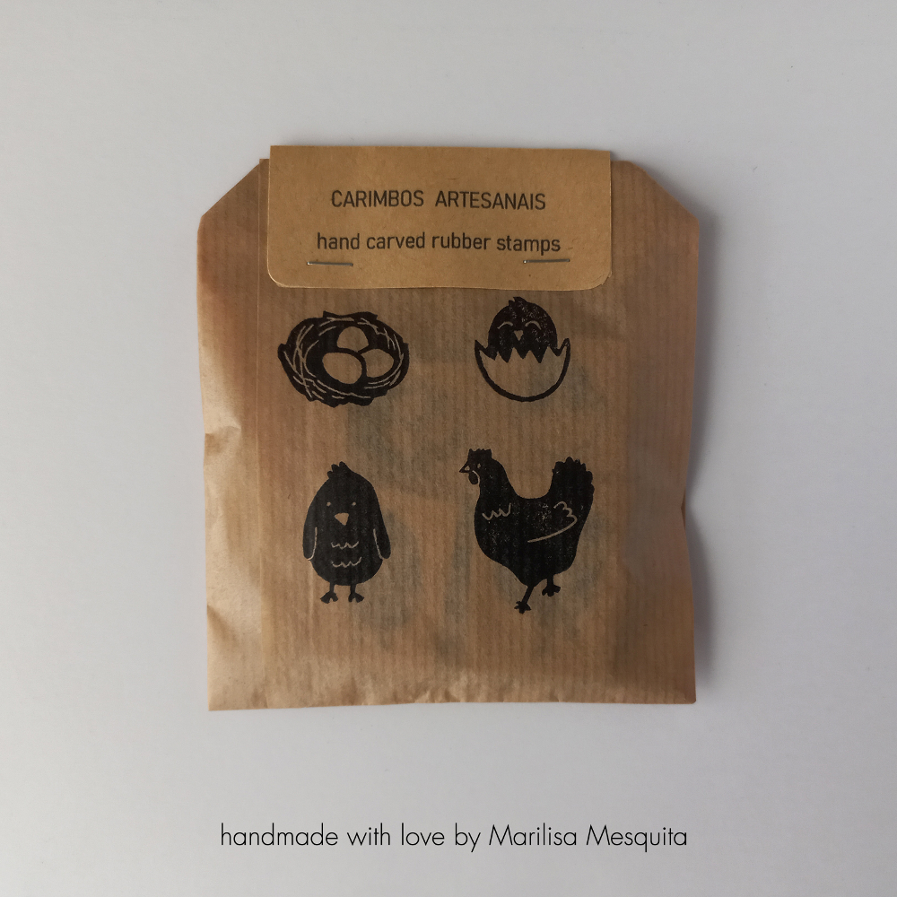 • Pacote de papel castanho com quatro carimbos de borracha artesanais de galinha e ovos