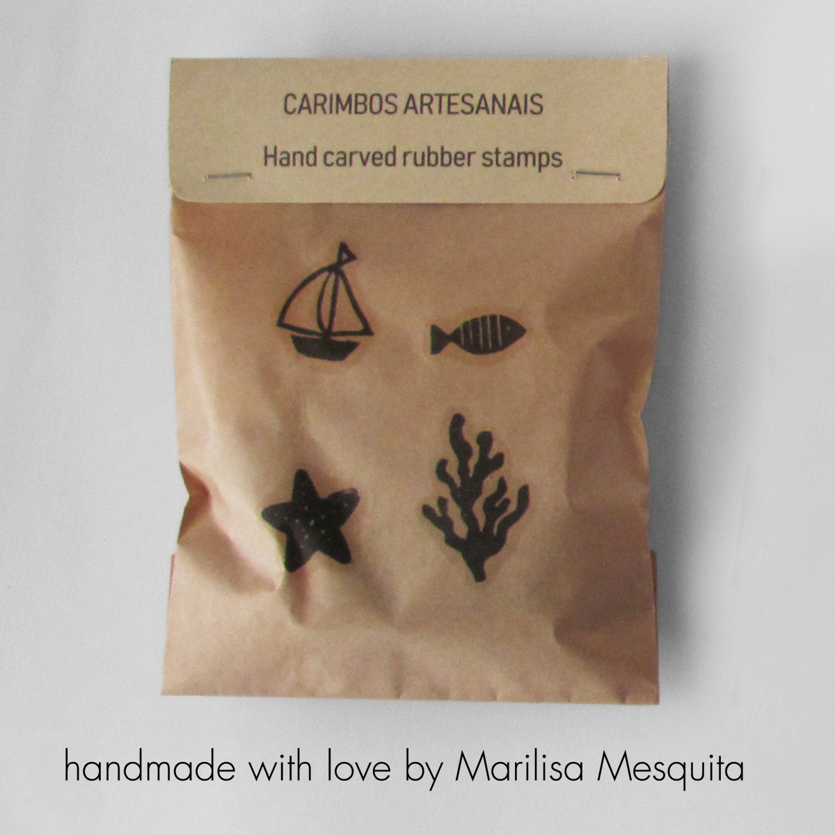 • Pacote de carimbos artesanais de borracha com imagens de barco, peixe, estrela-do-mar e coral.