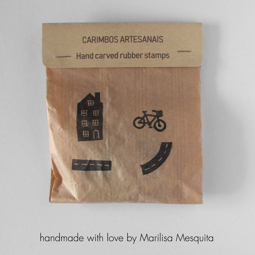 • Pacote com carimbos artesanais de borracha, imagens de casa, bicicleta e estrada, embalagem com rótulo em papel castanho.