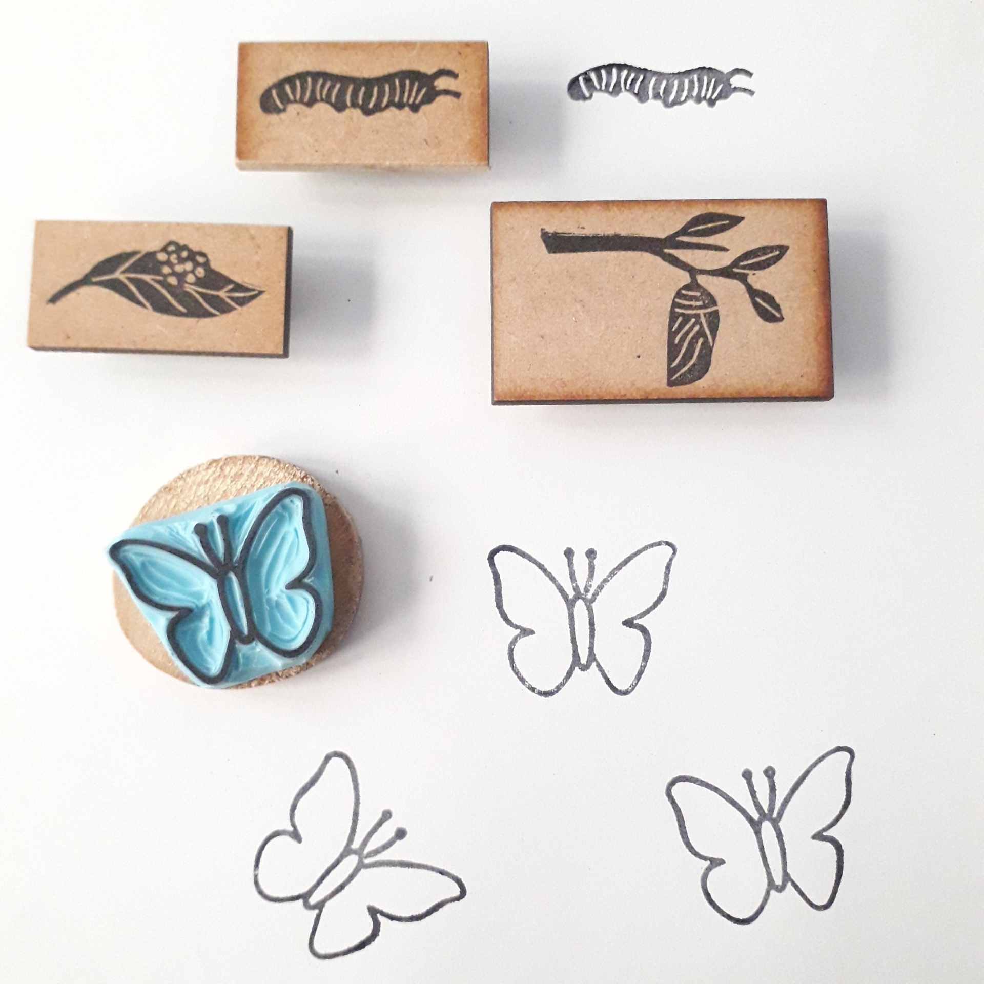 • Carimbos de madeira com desenhos de lagarta, casulo, folha e borboleta