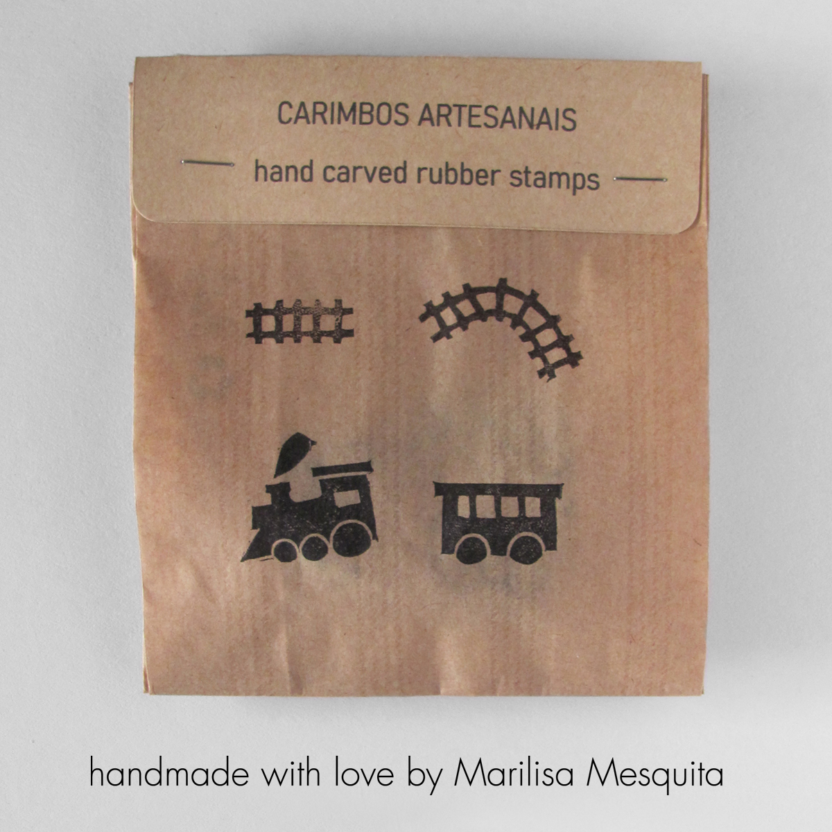 • Pacote de carimbos artesanais com desenhos de comboio e carrilhos