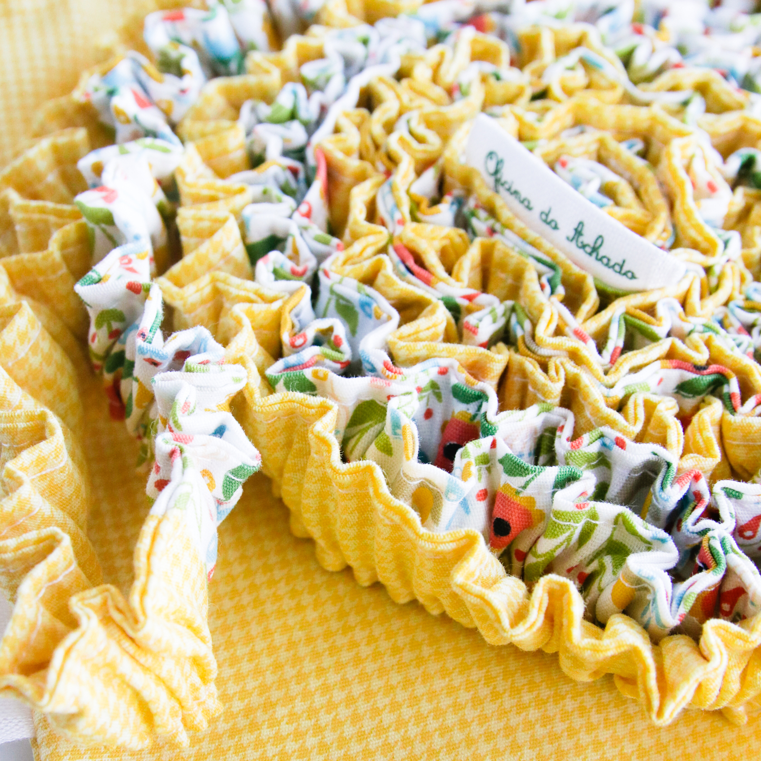 Detalhe de tecido amarelo xadrez e tecido branco com padrão floral, bordas franzidas e etiqueta bordada Casa da Abadá