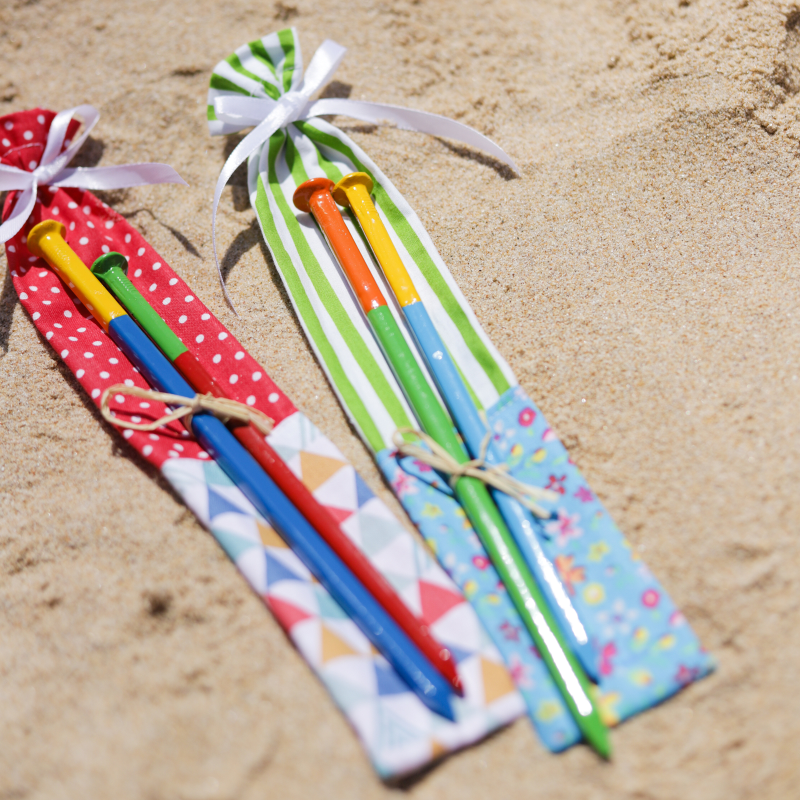 Dois pares de pauzinhos coloridos em bolsas de tecido listrado e geométrico na areia