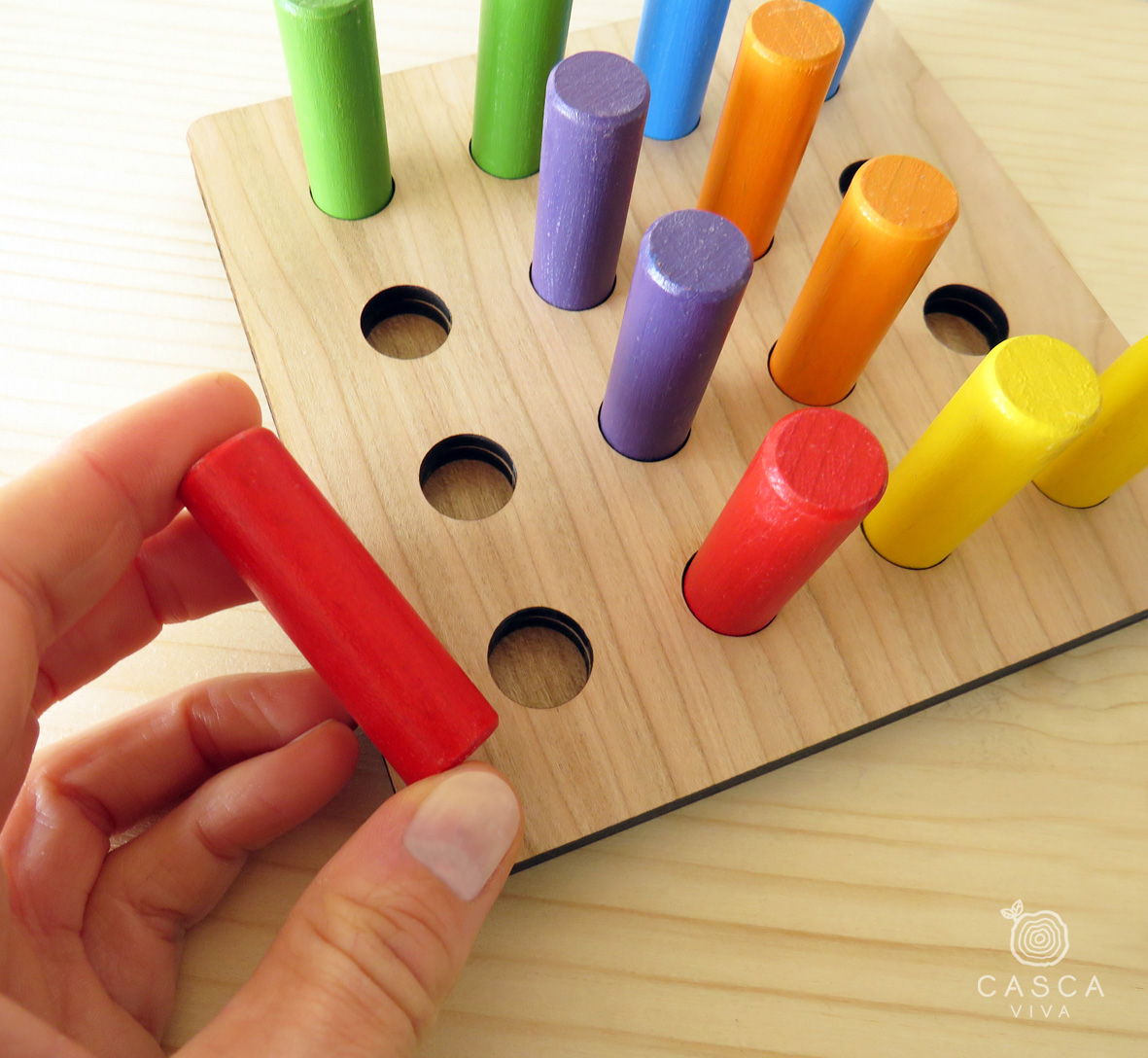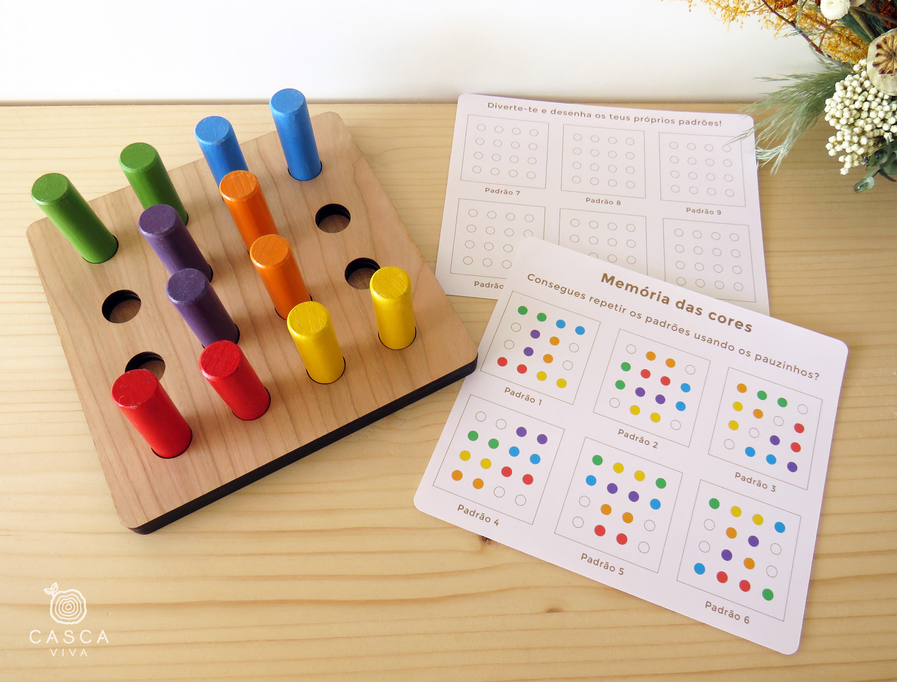 Jogo em madeira para recriação de padrões de cor. Uma base em madeira acompanhada de 12 pauzinhos de 6 cores (3 primárias e 3 secundárias) que a criança coloca nos furos do tabuleiro, de acordo com o padrão previamente criado.