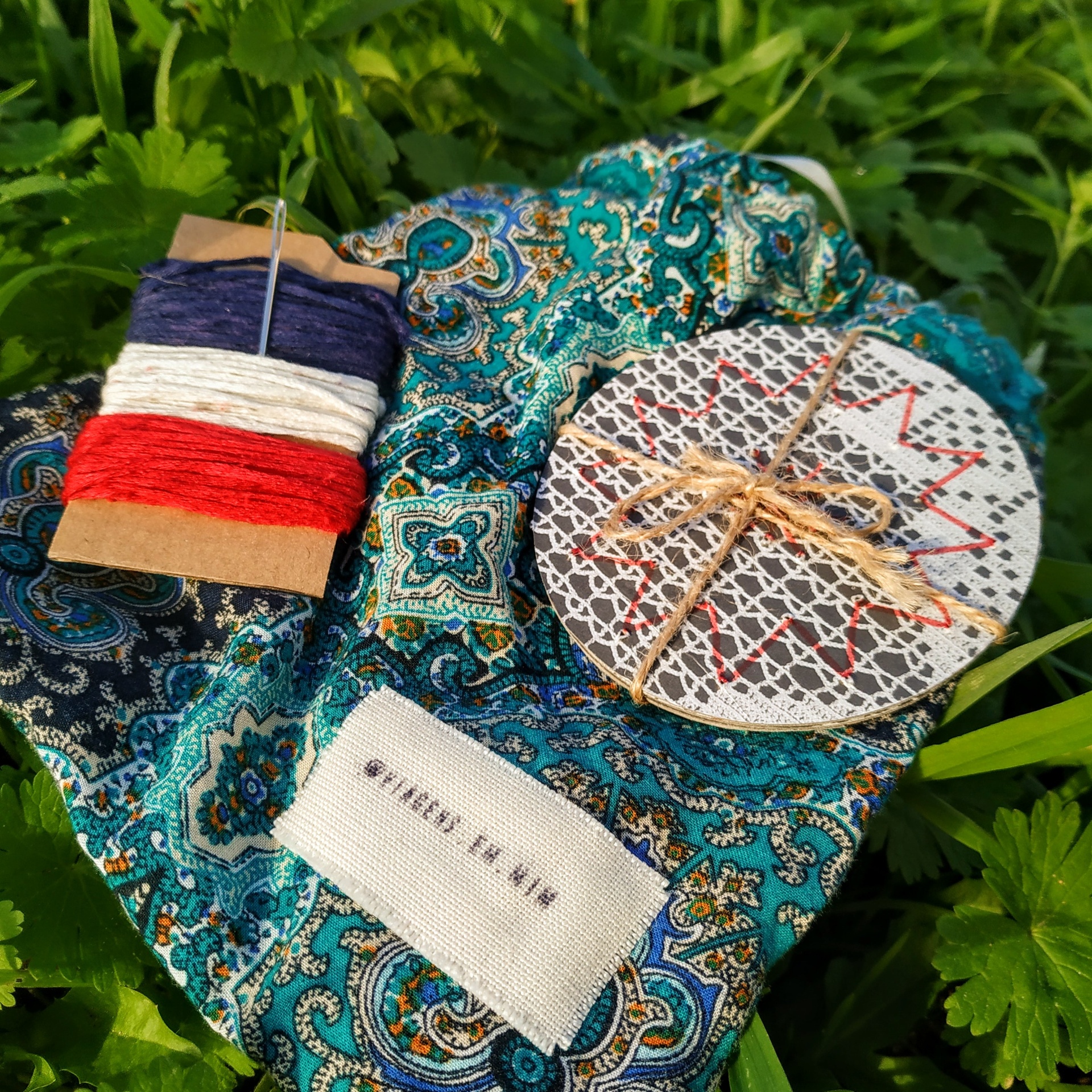 • Discos de tecido bordados, caixa com linhas coloridas, etiqueta e tecido paisley sobre folhas verdes