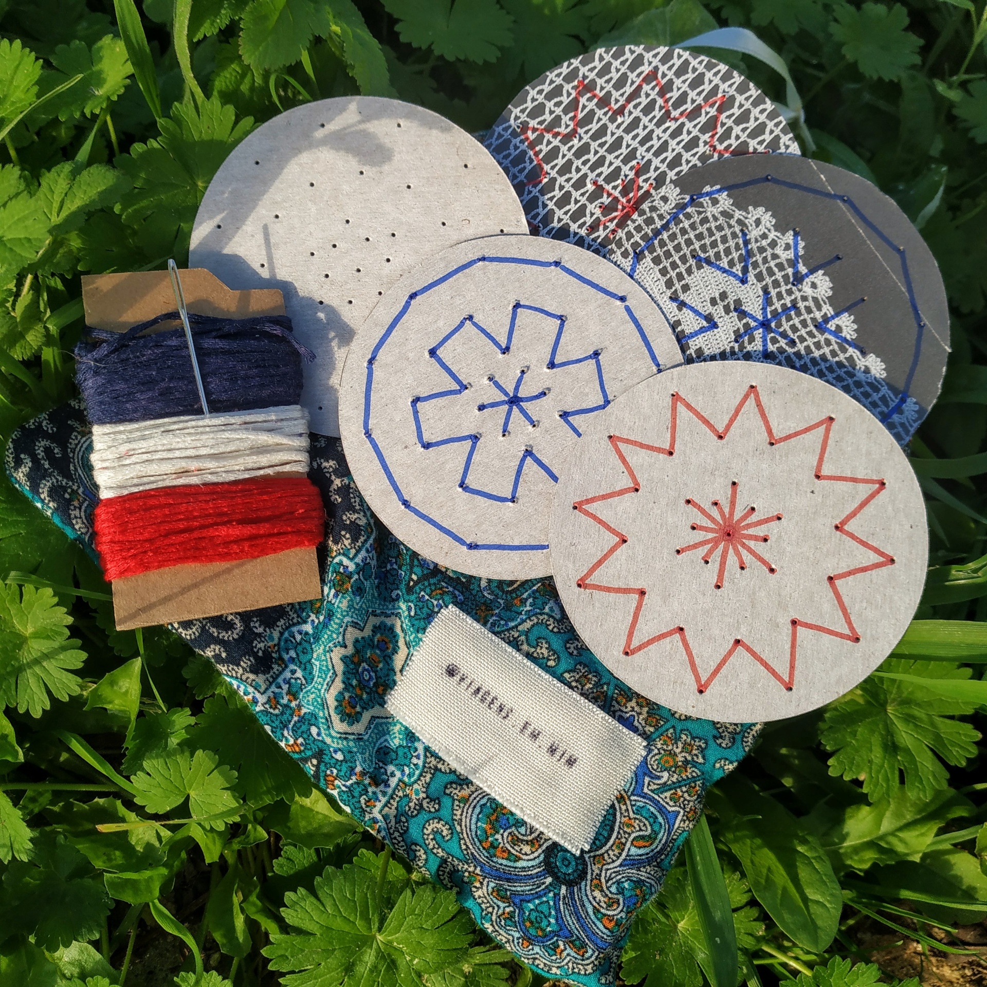 Discos de tecido bordados, caixa com linhas coloridas, etiqueta e tecido paisley sobre folhas verdes