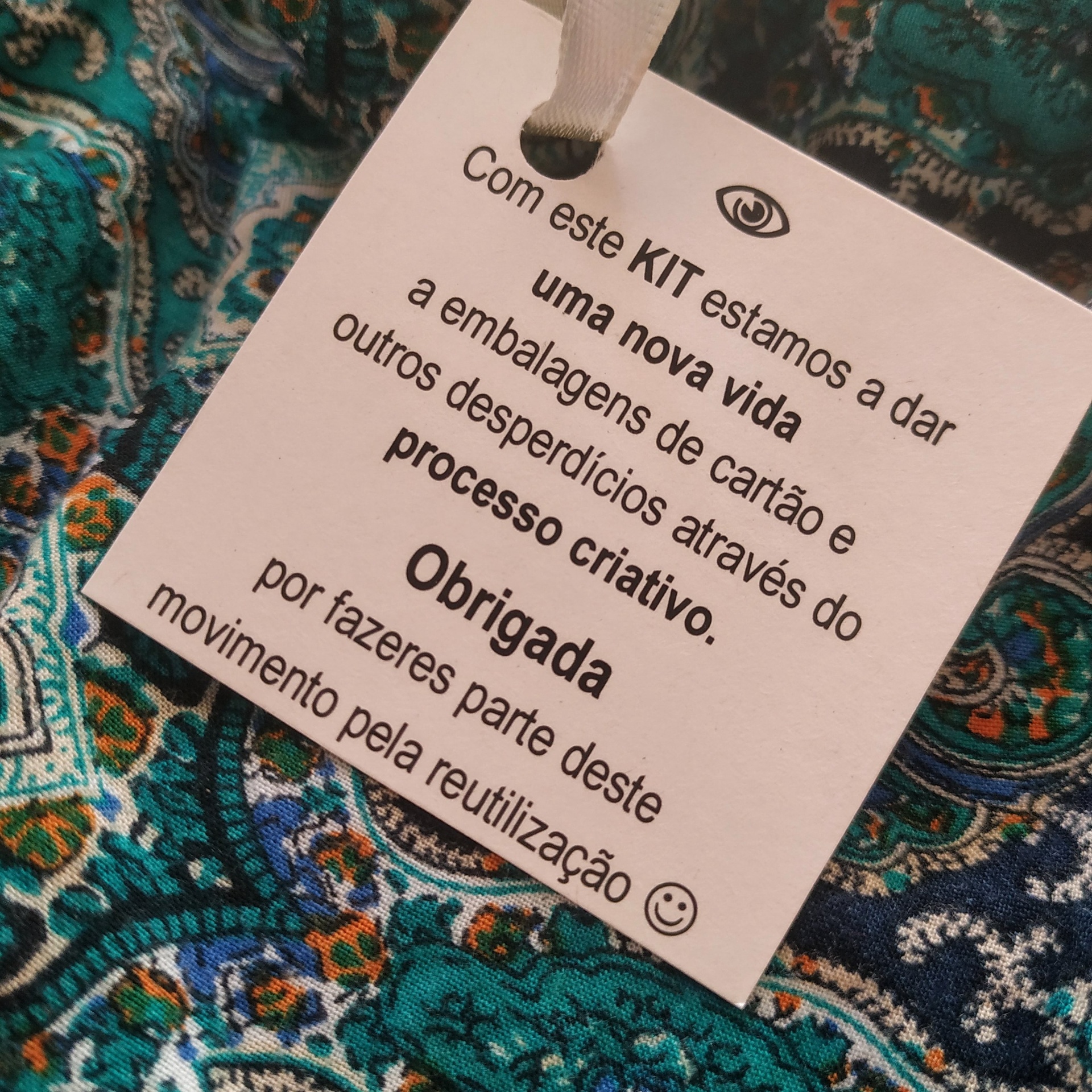 • saco de tecido pattern paisley azul verde com etiquetas e linhas coloridas e bastidor em tecido estampado