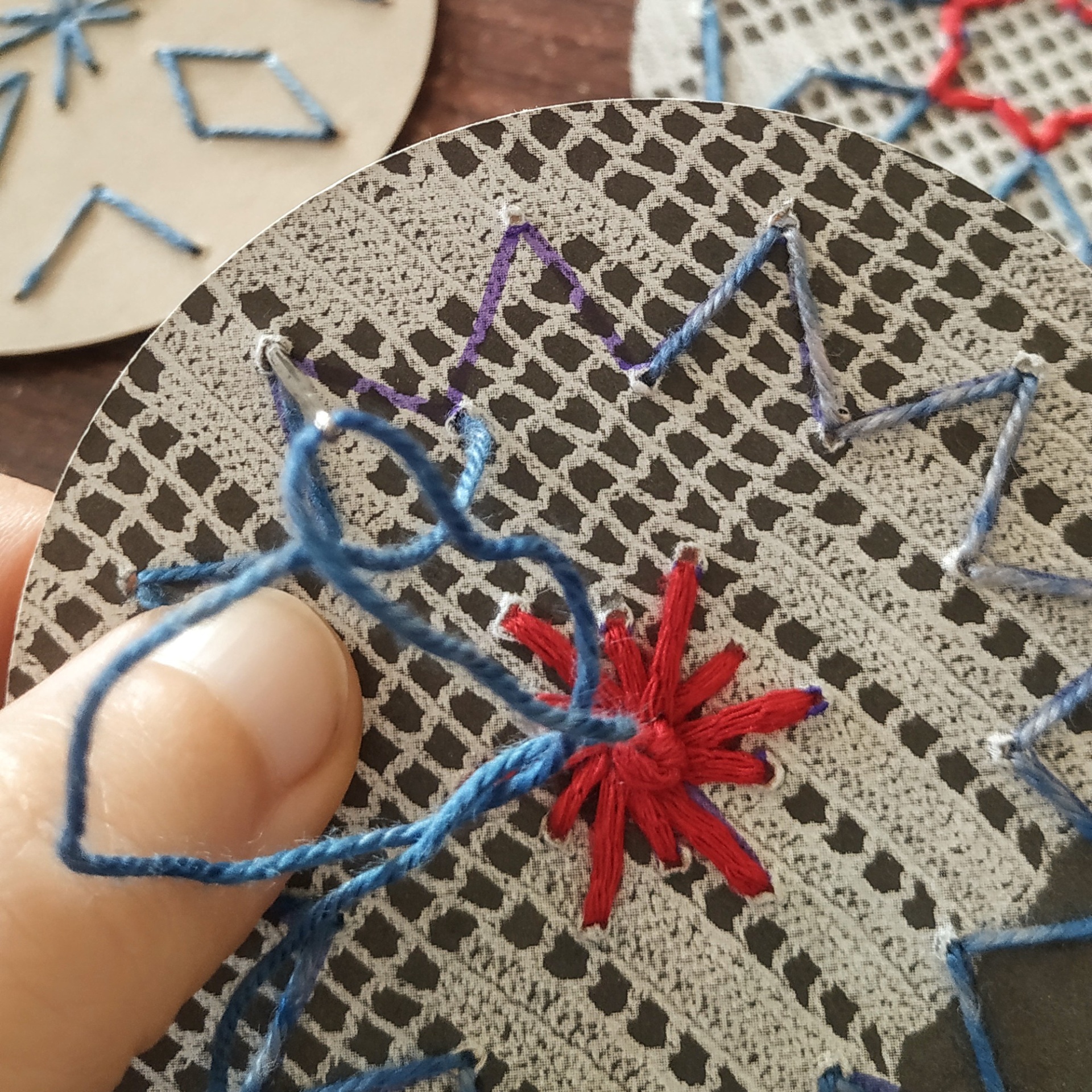 • Discos redondos com bordado em linhas coloridas e padrão cinza, dedos segurando um disco, fundo em madeira.