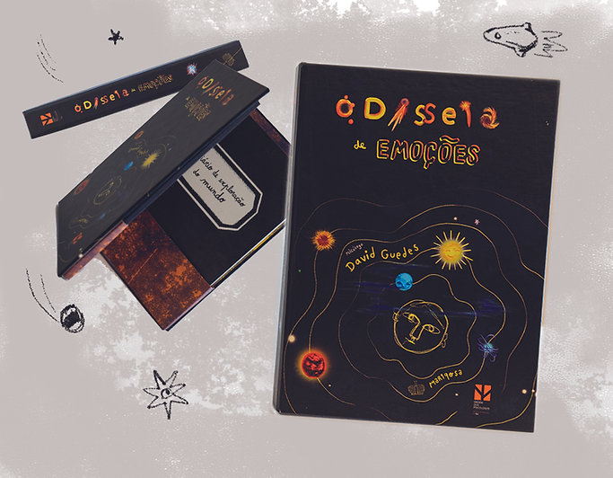 Livro e caixa pretos com ilustrações coloridas de corpos celestes e texto em português