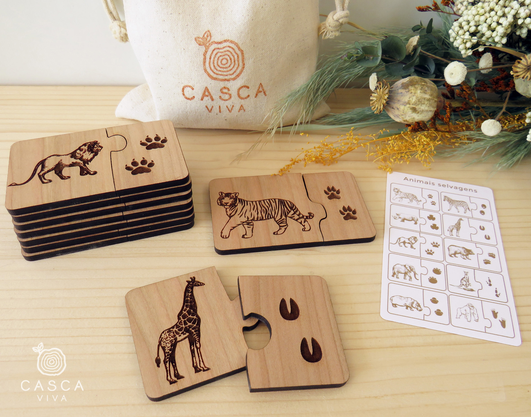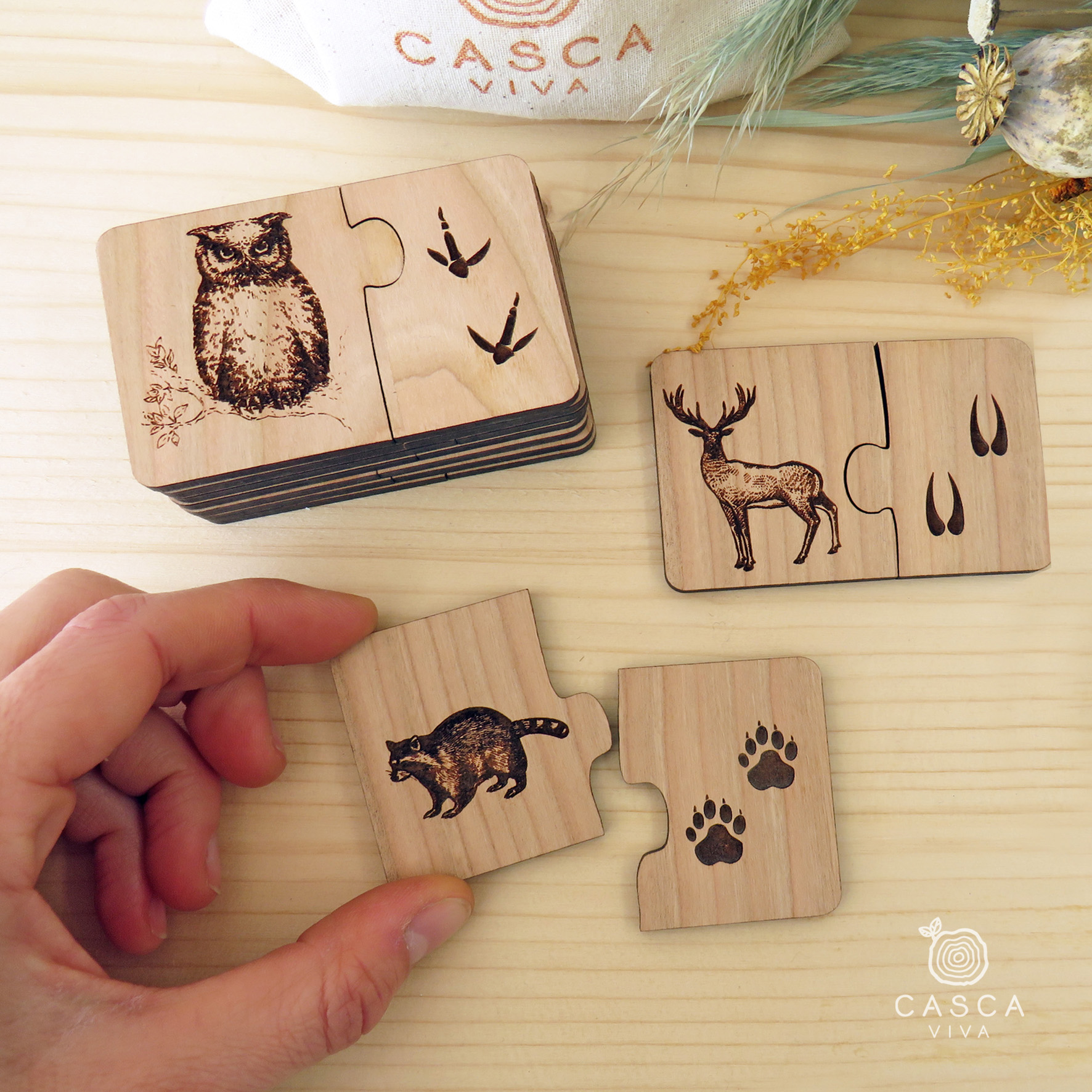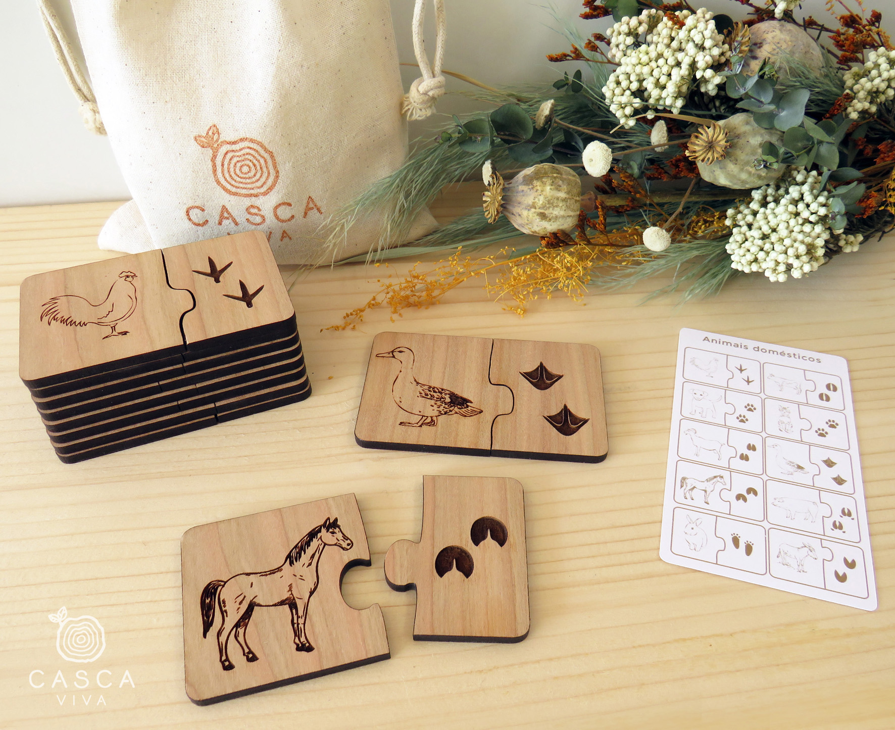 • Peças de puzzle em madeira com desenhos de animais e pegadas